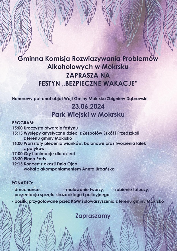 Gminna Komisja Rozwiązywania Problemów Alkoholowych w Mokrsku zaprasza na festyn „Bezpieczne Wakacje”, który odbędzie się w niedzielę 23 czerwca pod honorowym patronatem Wójta Gminy Mokrsko Zbigniewa Dąbrowskiego.
