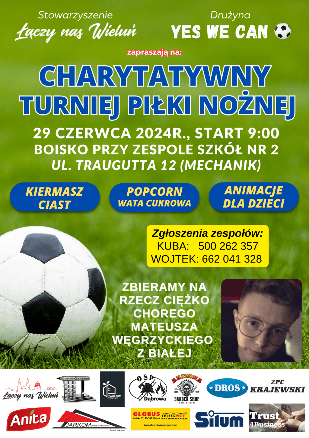 Już w najbliższą sobotę na boisku przy Zespole Szkół nr 2 w Wieluniu (popularny Mechanik), odbędzie się charytatywny turniej piłki nożnej, organizowany wspólnie przez stowarzyszenie „Łączy nas Wieluń” oraz drużynę piłkarską YES WE CAN.