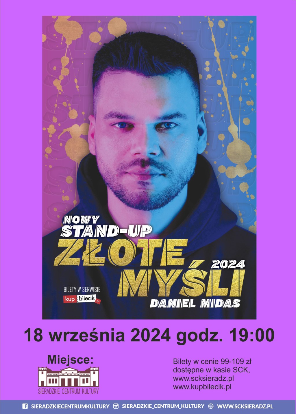Daniel Midas- odkrycie roku 2022. Komik, którego „Szopkę dla reportera” oglądają już chyba wszyscy. Jego internetową twórczość możecie sprawdzić na wszystkich popularnych portalach społecznościowych i przekonać się, że tak szybko nie rozbawił Was jeszcze nikt . Najnowszy program Daniela Midasa- Złote Myśli, to już jego trzeci materiał stand-upowy. Daniel porusza w nim złote historie ze swojego życia i nie tylko. Musicie je usłyszeć!