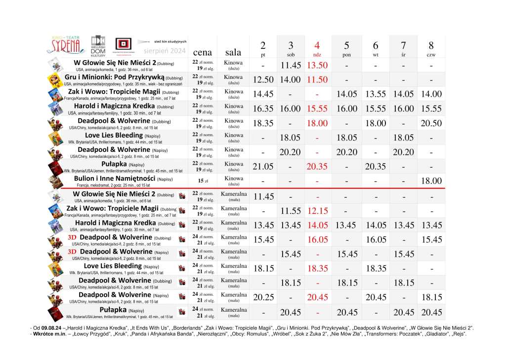 Kino Teatr „Syrena” w Wieluniu zaprasza na seanse filmowe. Na plakacie poniżej prezentujemy, co placówka przy ul. Narutowicza 2 zaprezentuje w dniach od 2 do 8 sierpnia. Bilety można zakupić TUTAJ.