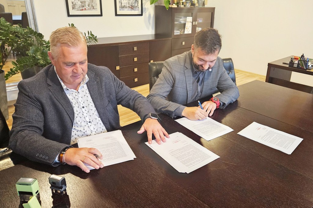 Wicestarosta sieradzki Konrad Wilczyński, prezes zarządu firmy Defero Tomasz Rychłowski oraz dyrektor Biura Wystaw Artystycznych w Sieradzu Tomasz Oszczęda podpisali umowę na remont zabytkowej siedziby galerii przy ul. Kościuszki 3.