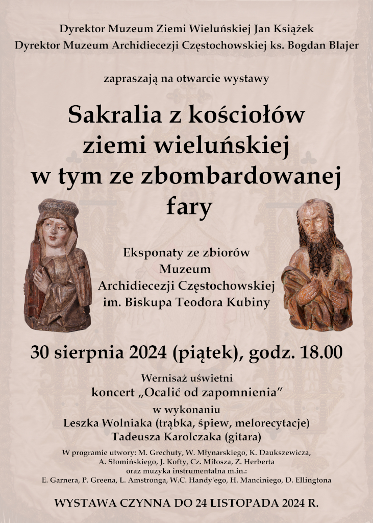 Muzeum Ziemi Wieluńskiej zaprasza na wernisaż wystawy „Sakralia z kościołów ziemi wieluńskiej w tym ze zbombardowanej fary”.