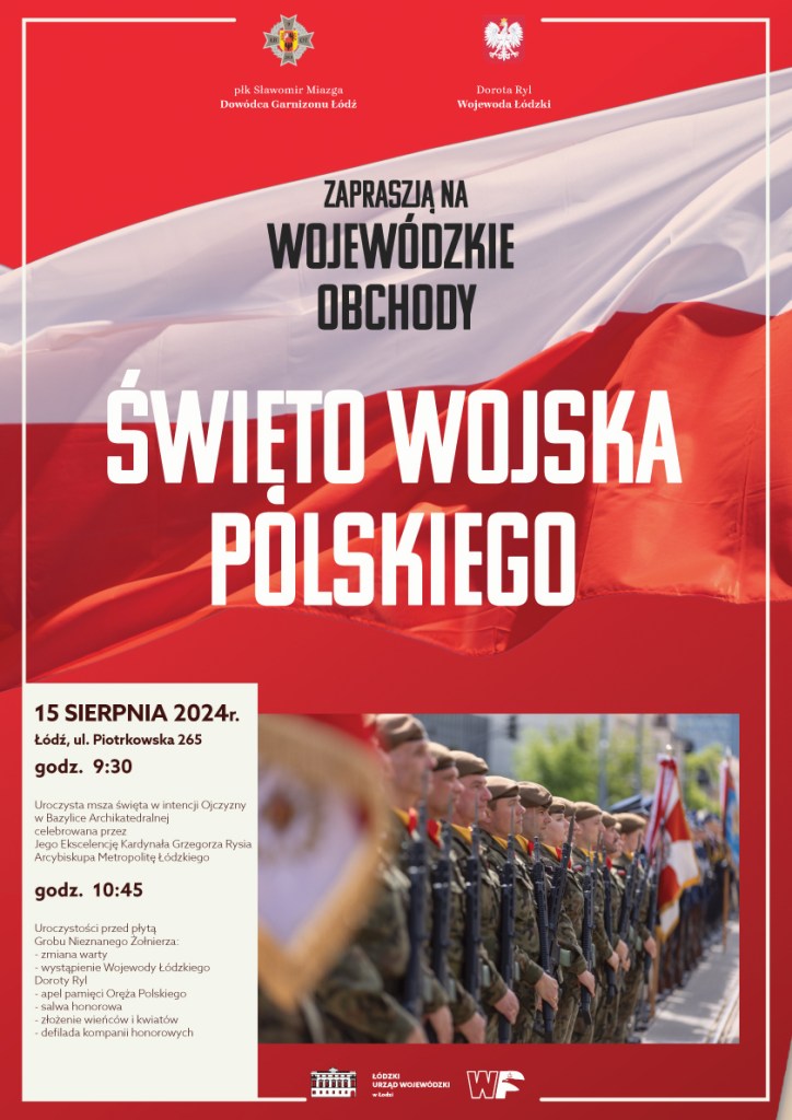 Wojewoda łódzki Dorota Ryl oraz dowódca garnizonu Łódź pułkownik Sławomir Miazga zapraszają na wojewódzkie obchody Święto Wojska Polskiego.