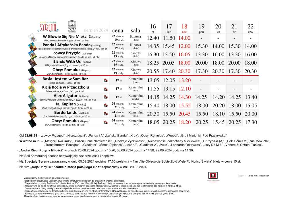 Kino Teatr „Syrena” w Wieluniu zaprasza na seanse filmowe. Na plakacie poniżej prezentujemy, co placówka przy ul. Narutowicza 2 zaprezentuje w dniach od 16 do 22 sierpnia. Bilety można zakupić TUTAJ.