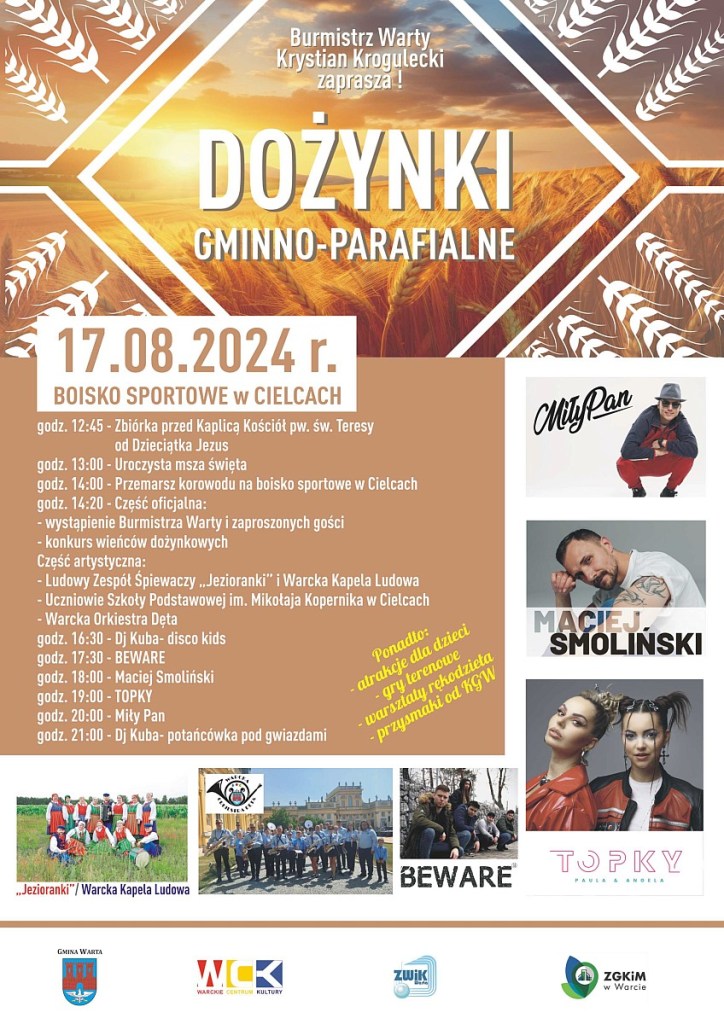 Dożynki Gminno-Parafialne odbędą się już dzisiaj, czyli 17 sierpnia na boisku sportowym w Cielcach.