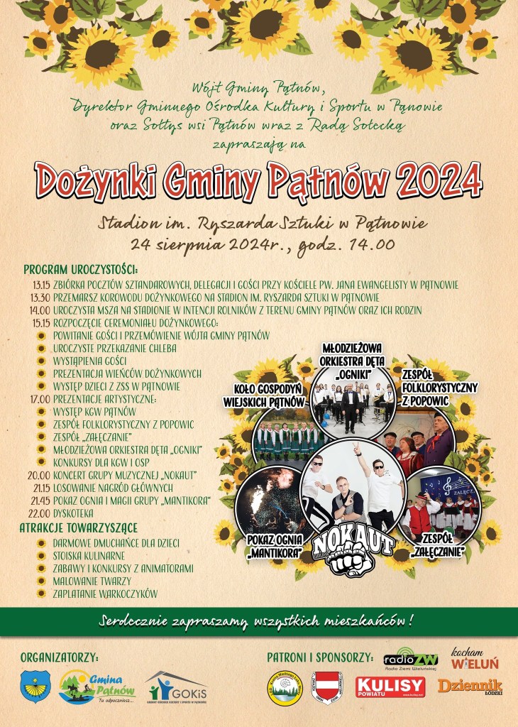 Dożynki Gminy Pątnów odbędą się w sobotę, 24 sierpnia na stadionie w Pątnowie.