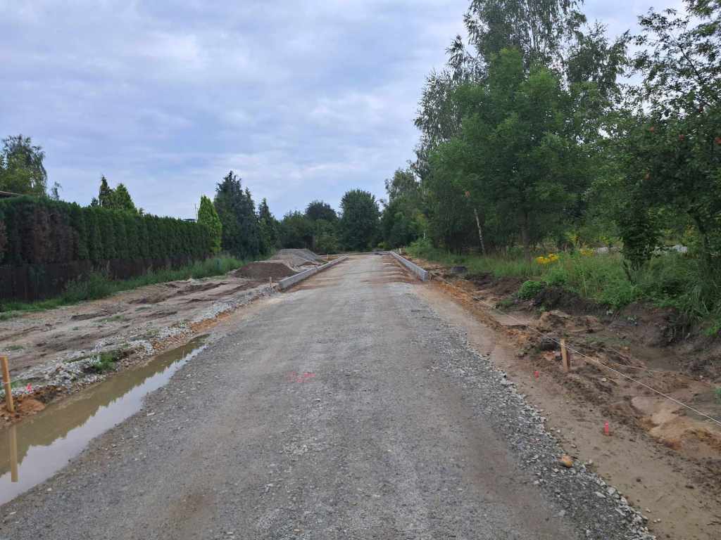 Wykonane zostaną: droga dwukierunkowa o nawierzchni z masy bitumicznej ze zjazdami chodniki z kostki betonowej na całej długości drogi oraz ścieżka pieszo-rowerowa.