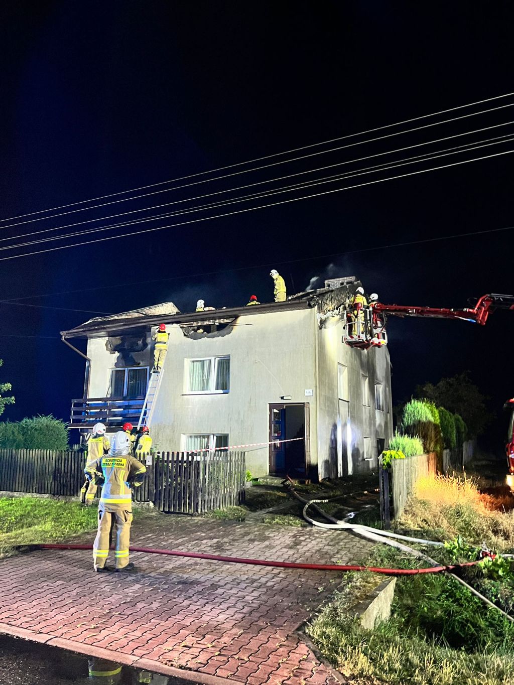 Na miejscu był rozwinięty pożar poddasza budynku krytego płytami bitumicznymi. Spaliło się około 150m2 dachu, ściany kolankowe, okna, drzwi, okopceniu uległy ściany i elewacja.
