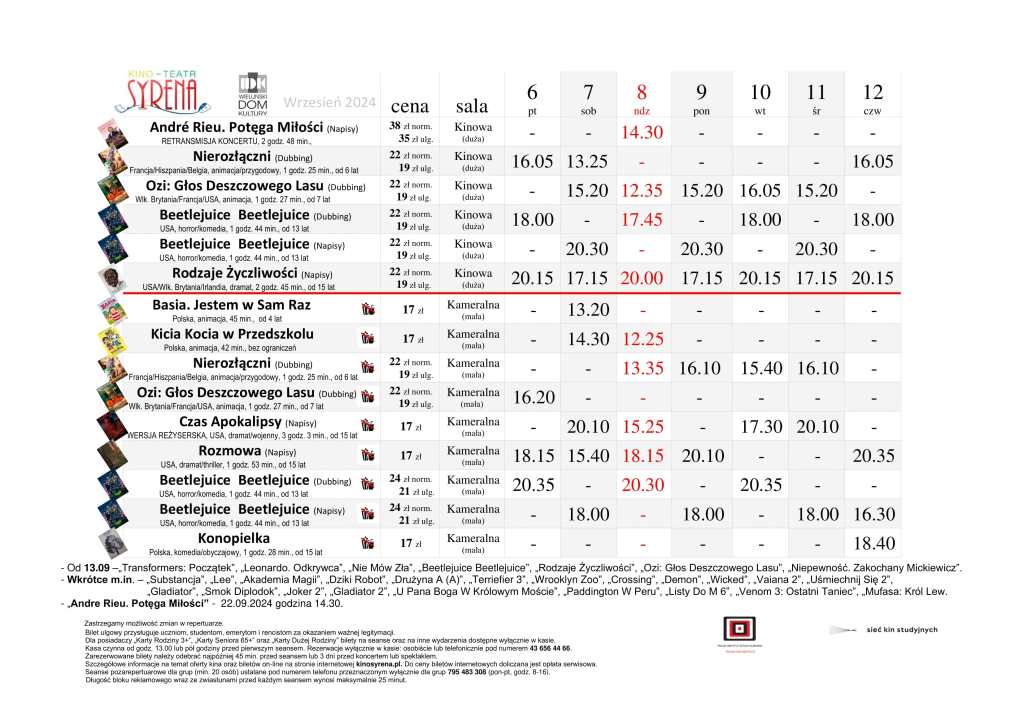 Kino Teatr „Syrena” w Wieluniu zaprasza na seanse filmowe. Na plakacie poniżej prezentujemy, co placówka przy ul. Narutowicza 2 zaprezentuje w dniach od 6 do 12 września. Bilety można zakupić TUTAJ.