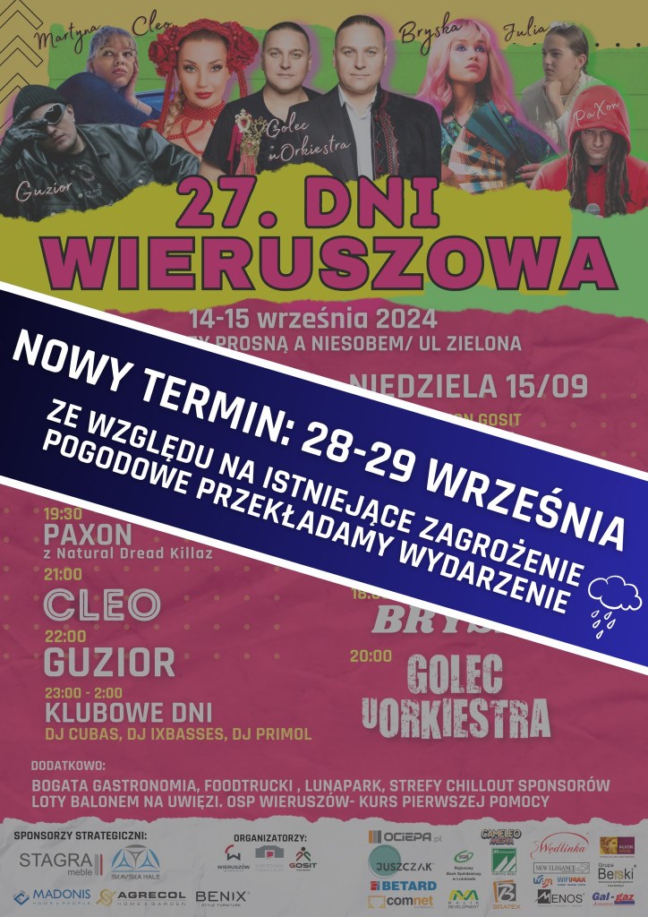 W związku z istniejącym zagrożeniem pogodowym, organizatorzy Dni Wieruszowa zmuszeni zostali przesunąć w czasie wydarzenie. Niedługo podamy więcej informacji.