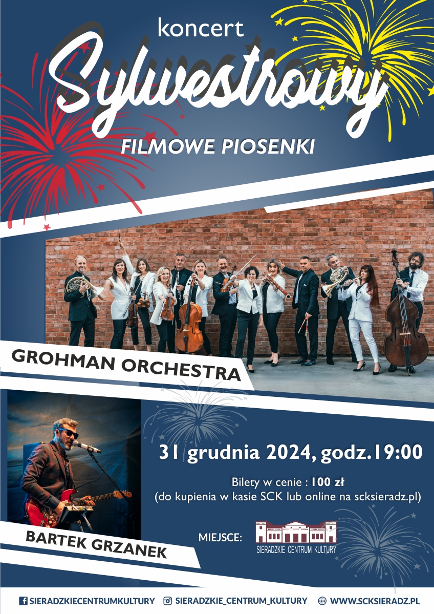 Sieradzkie Centrum Kultury zaprasza na KONCERT SYLWESTROWY 2024 pod nazwą„Filmowe Piosenki”. Wystąpi Grohman Orchestra wspólnie z Bartkiem Grzanką