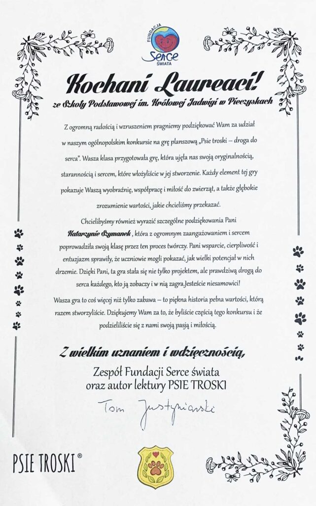 13 września 2024 r w Szkole Podstawowej im. Królowej Jadwigi w Pieczyskach nastąpiło rozdanie nagród w Ogólnopolskim Konkursie „Gra Planszowa – Psie Troski”.