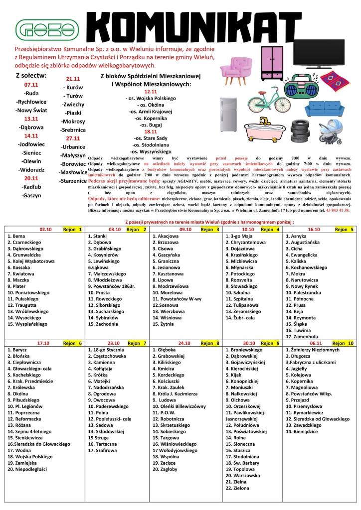 W środę rusza zbiórka odpadów wielkogabarytowych na terenie gminy Wieluń. Terminarz jest dostępny na plakacie poniżej.