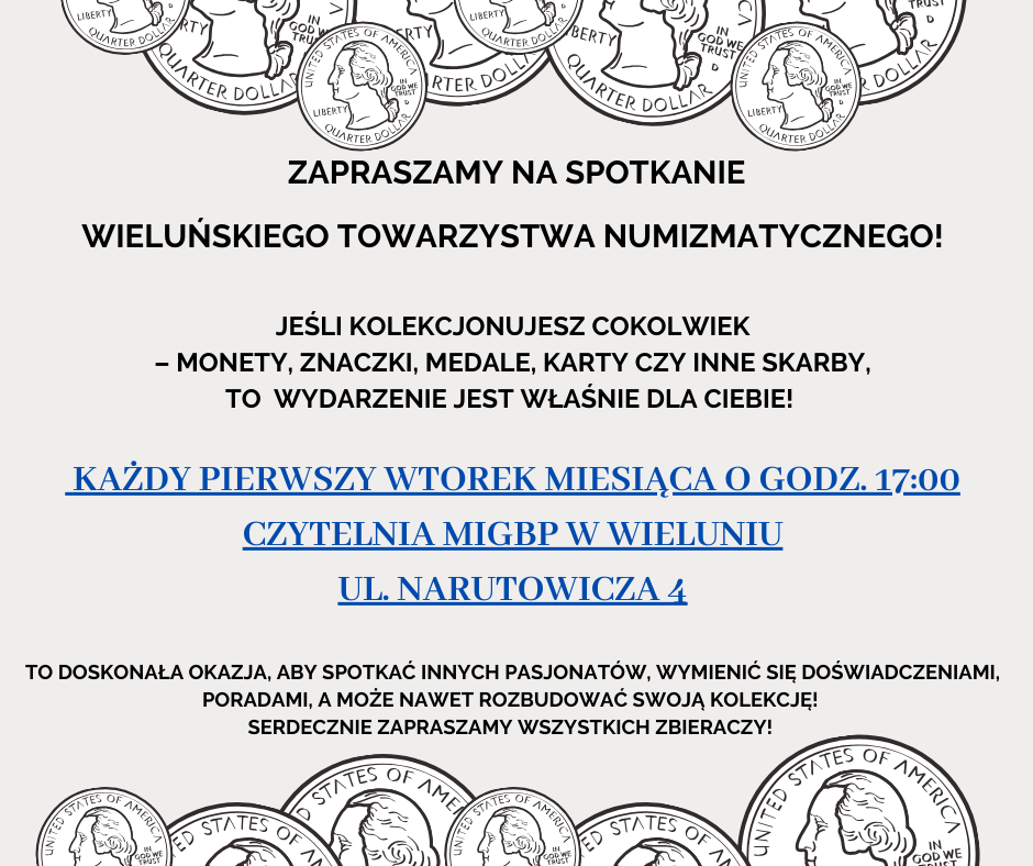 Miejska i Gminna Biblioteka Publiczna w Wieluniu zaprasza na spotkanie Wieluńskiego Towarzystwa Numizmatycznego.