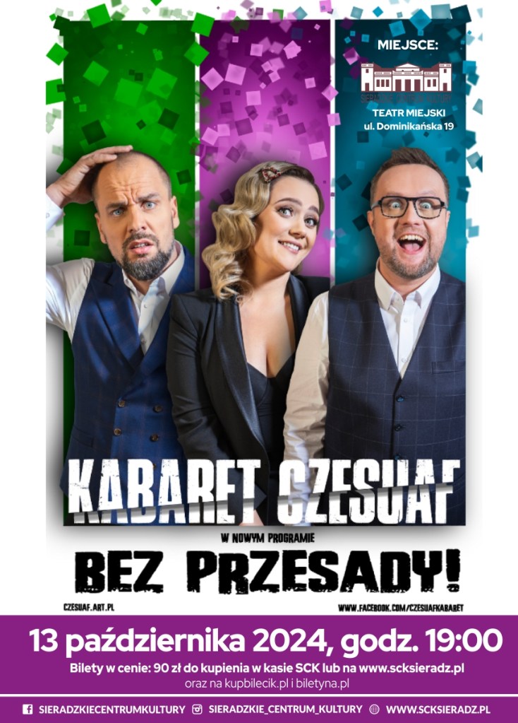 KABARET CZESUAF rusza w Polskę. Poprzedni program „Skandal!” obejrzały tysiące widzów, mamy nadzieję, że nowe skecze znajdą jeszcze większe rzesze odbiorców. Może nawet miliony? Bez przesady! Właśnie taki tytuł nosi nowy program Czesuafów. „Bez przesady!” to próba zmierzenia się z tym, co widzimy dookoła siebie. Dlaczego wszystko wyolbrzymiamy? Polscy piłkarze przegrają mecz – „klęska”, „tragedia”. Iga Świątek wygra – „miazga”, „pogrom”. A powiedzmy sobie szczerze, najczęściej w Polsce jest po prostu średnio. Za to na pewno średni nie jest nowy program kabaretu Czesuaf, bowiem Olga, Tomek i Maciek dają z siebie na scenie wszystko, a nawet jeszcze więcej. Recenzje widzów nie kłamią – program kabaretu Czesuaf to dwie godziny zabawy na najwyższym poziomie! To będzie naprawdę niezapomniany wieczór… Chyba że zagramy po południu, to wtedy niezapomniane popołudnie. I mówimy to bez przesady!