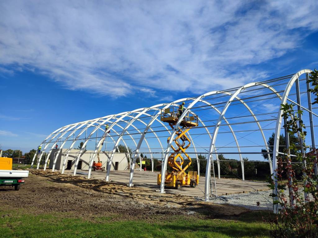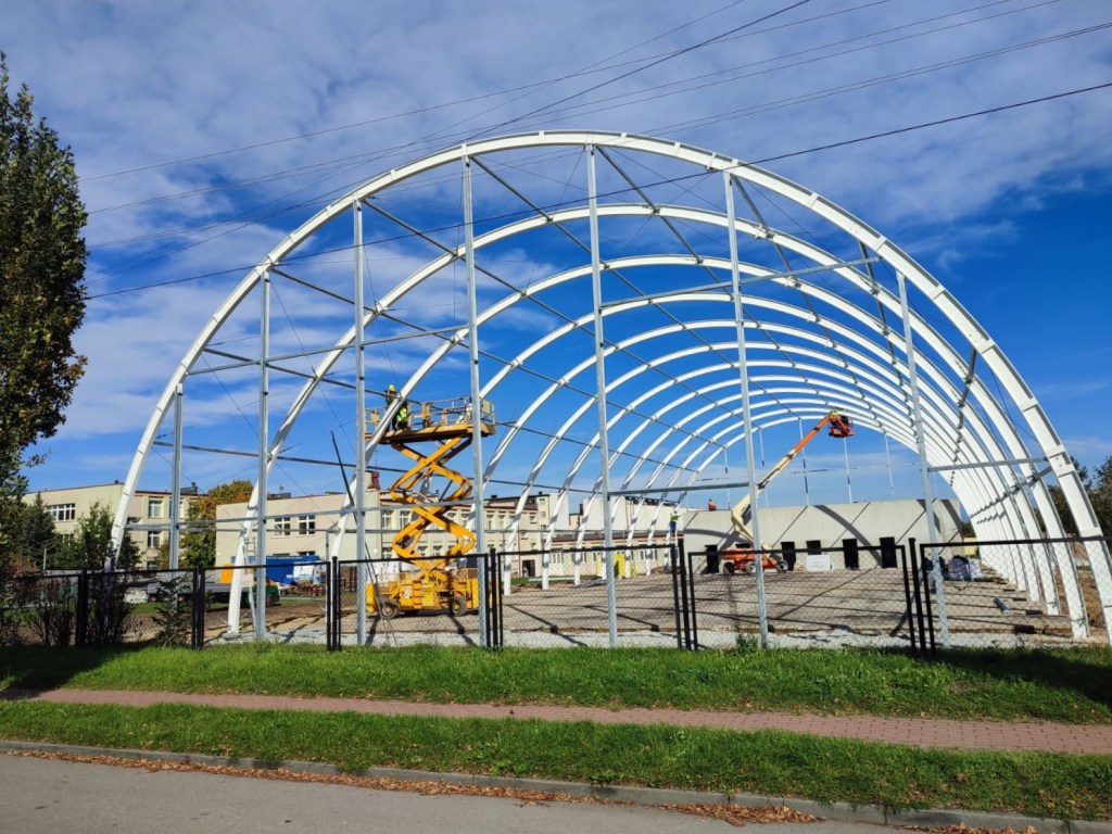 Trwa budowa zadaszenia boiska o stałej konstrukcji wraz z zapleczem sanitarno-socjalnym przy Szkoła Podstawowa nr 2 im. Henryka Sienkiewicza w Wieluniu w ramach zadania „Budowa hali przy SP 2 – zwiększenie bazy sportowej w Gminie Wieluń”.