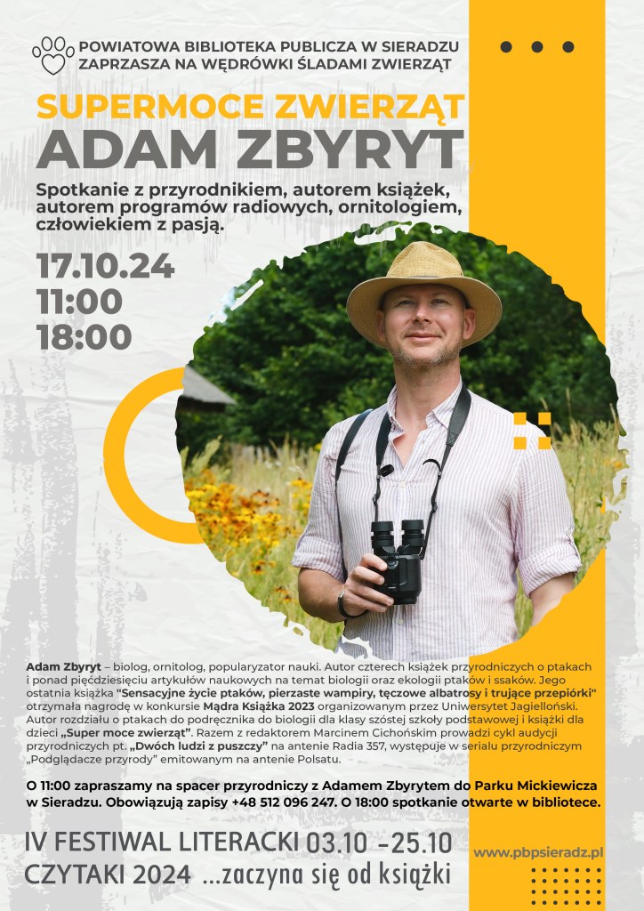 Powiatowa Biblioteka Publiczna w Sieradzu zaprasza w czwartek 17 października o godzinie 11:00 na przyrodniczy spacer w Parku im. Mickiewicza (obowiązują zapisy pod nr 512 096 247), a o godz. 18:00 w Bibliotece na ul. Żwirki i Wigury 4 gość opowie o supermocach i sensacyjnym życiu zwierząt.