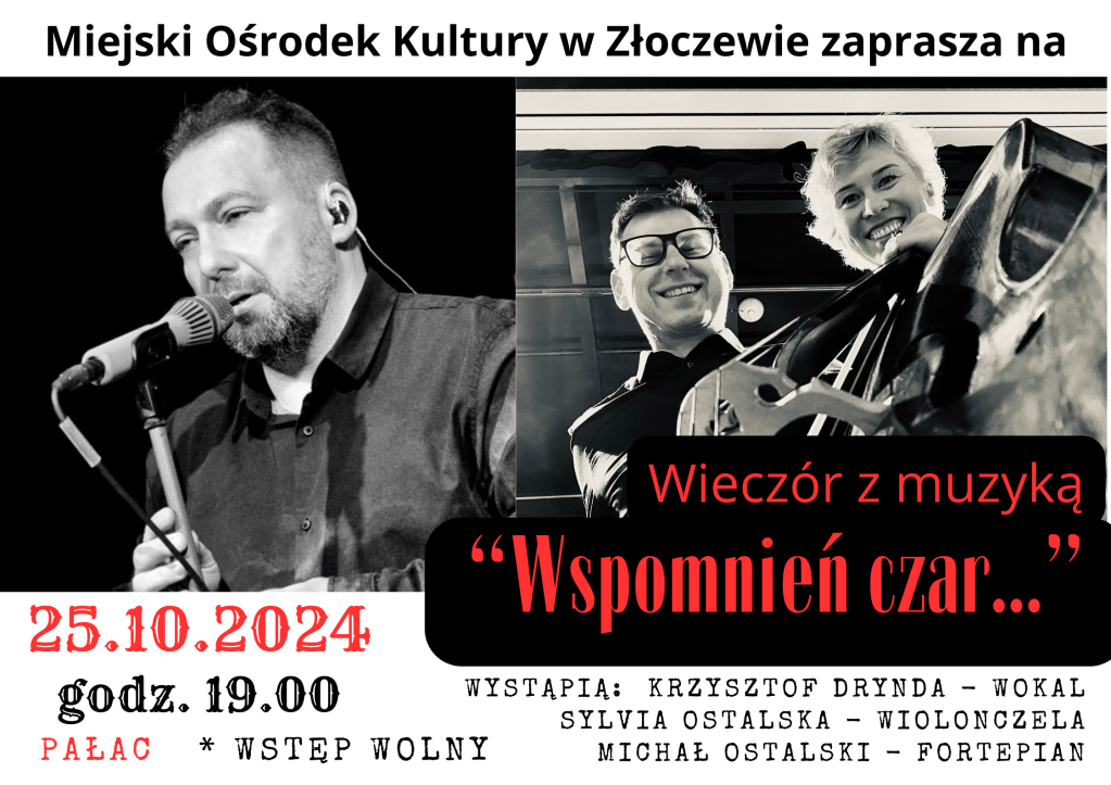 Wystąpią: Krzysztof Drynda – wokal, Sylvia Ostalska – wiolonczela i Michał Ostalski – fortepian, zaprezentują koncert pt. „Wspomnień czar…”. W programie min. piosenki Zauchy, Skaldów, Niemena, Rynkowskiego, Meca czy Grechuty.
