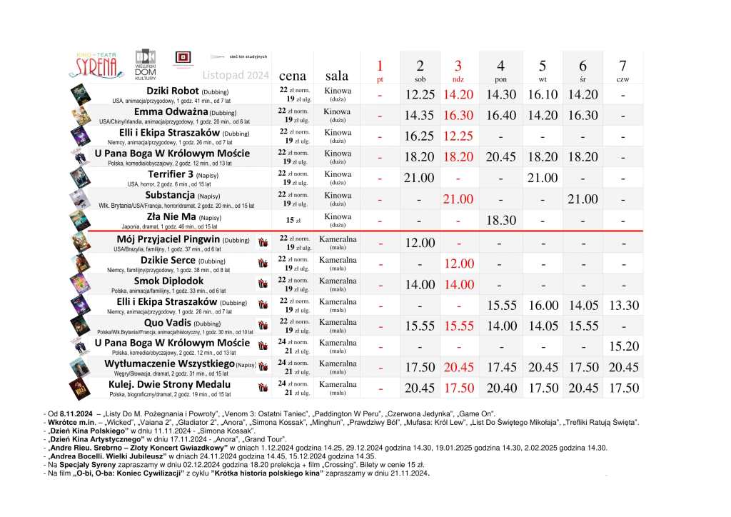 Kino Teatr „Syrena” w Wieluniu zaprasza na seanse filmowe. Na plakacie poniżej prezentujemy, co placówka przy ul. Narutowicza 2 zaprezentuje w dniach od 1 do 7 listopada. Bilety można zakupić TUTAJ.