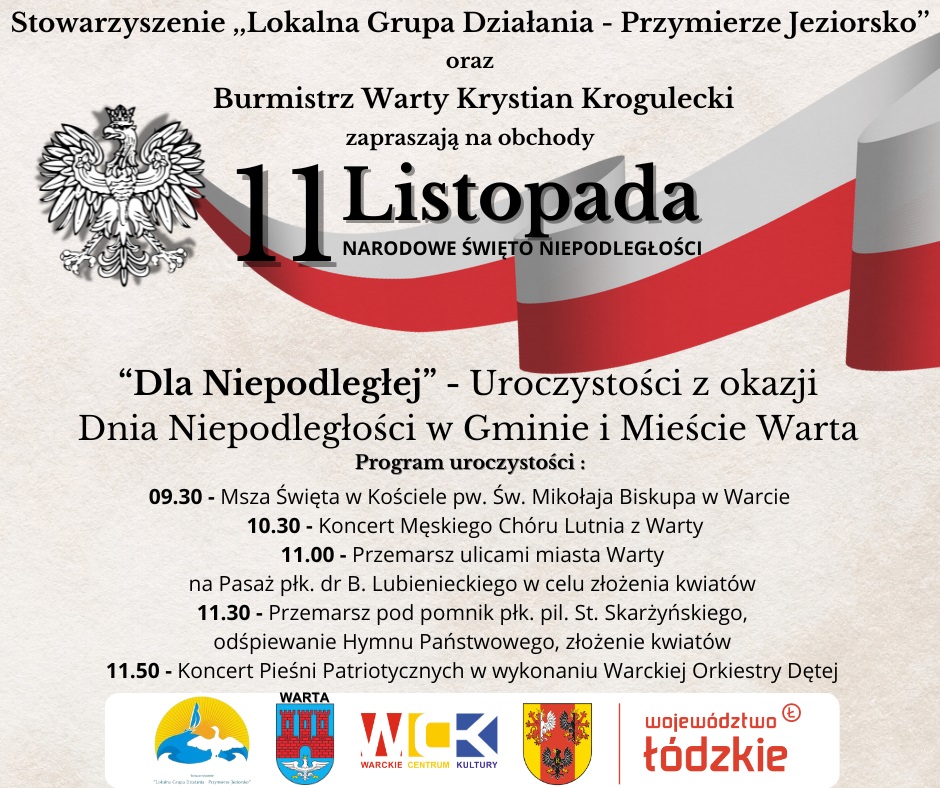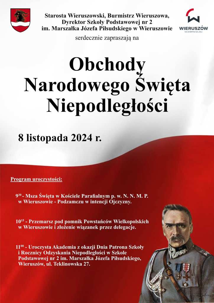 Powiat wieluński świętuje 11 listopada w Osjakowie. Początek o godz. 11.30. Zbiórka przed siedzibą OSP w Osjakowie. O godzinie 14.00 w hali sportowej przy Szkole Podstawowej im. Powstańców Styczniowych (ul Wieluńska 14) rozpocznie się spotkanie niepodległościowe. W programie m.in. spektakl „Pełni wdzięczności za dar niepodległości”.