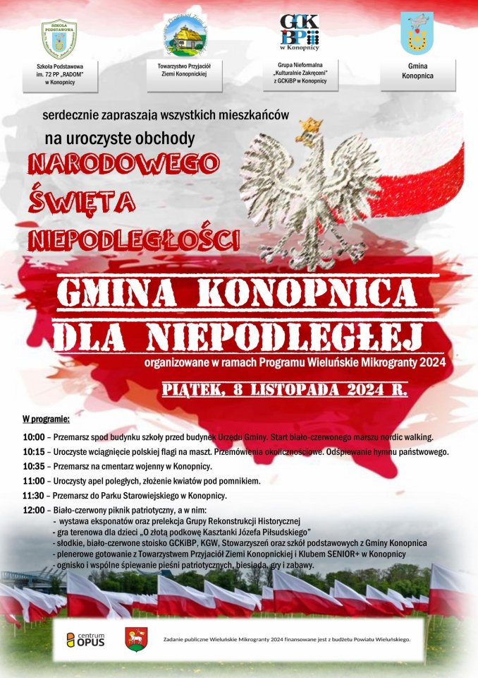 W piątek świętuje także gmina Konopnica. O godz. 12.00 na terenie Parku Starowiejskiego rozpocznie się biało-czerwony piknik „Gmina Konopnica dla Niepodległej”. Poprzedzą go uroczystości przed budynkiem urzędu gminy. W programie m.in. gra terenowa dla dzieci „O złotą podkowę kasztanki marszałka Piłsudskiego”, prelekcje grup rekonstrukcyjnych, wspólne śpiewanie pieśni patriotycznych przy ognisku. Początek o godz. 10.00. Stąd wyruszy biało-czerwony marsz nordic walking.