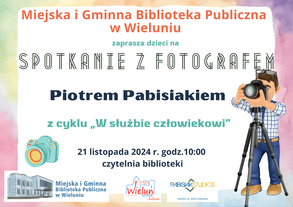 Miejska i Gminna Biblioteka Publiczna w Wieluniu zaprasza dzieci na spotkanie z fotografem – Piotrem Pabisiakiem. Jest to cykl pod nazwą „W służbie człowiekowi”.