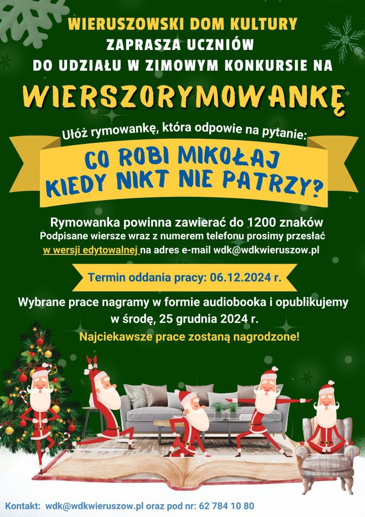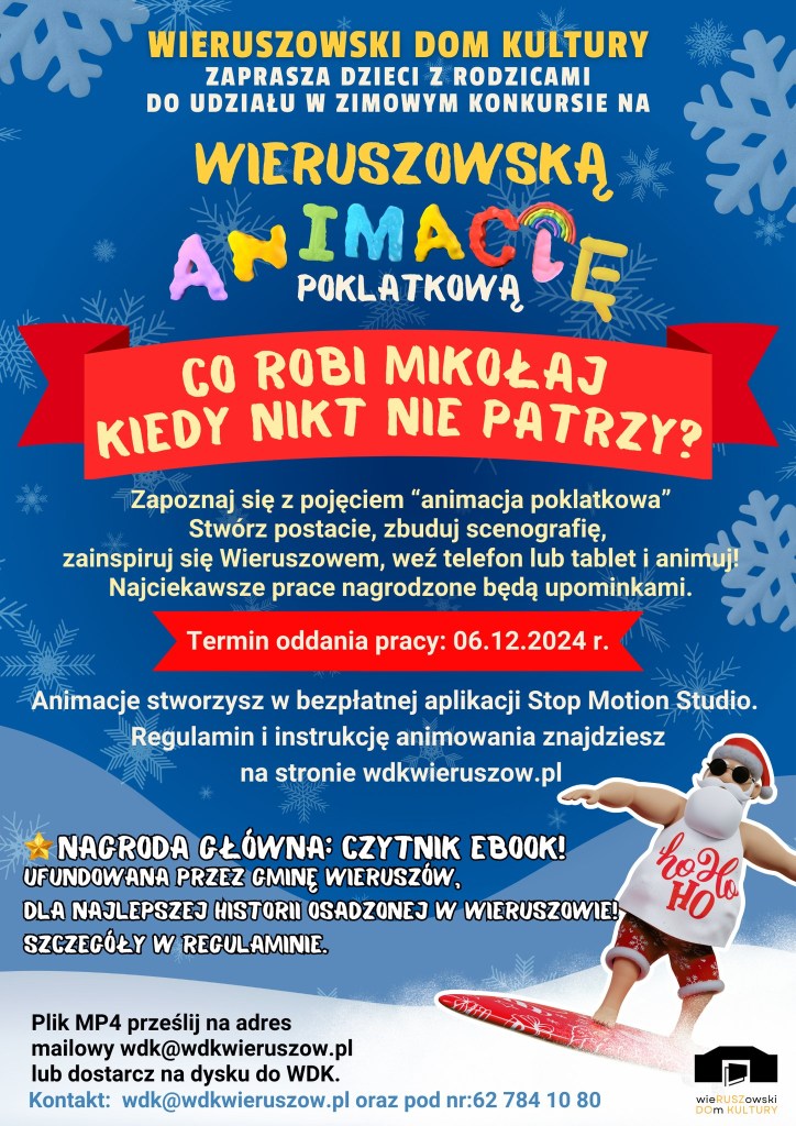 Wieruszowski Dom Kultury zaprasza do wzięcia udziału w dwóch świątecznych konkursach! Konkurs pierwszy to stworzenie animacji poklatkowej pod nazwą „Co robi Mikołaj gdy nikt nie patrzy?”. Film należy stworzyć w bezpłatnej aplikacji – na stronie internetowej domu kultury można znaleźć instrukcję obsługi programu. Animacja powinna trwać od 30 sekund do 4 minut. Prace można składać do 6 grudnia.