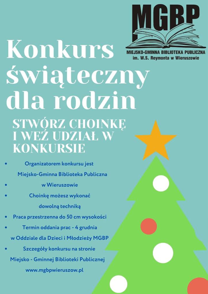 Warto wziąć udział w rodzinnym konkursie świątecznym organizowanym przez Miejsko-Gminną Bibliotekę Publiczną w Wieruszowie. Tematem konkursu jest: „Świąteczna choinka”. Praca konkursowa powinna być pracą plastyczną przestrzenną wykonaną dowolną techniką o wymiarach do 50 cm.