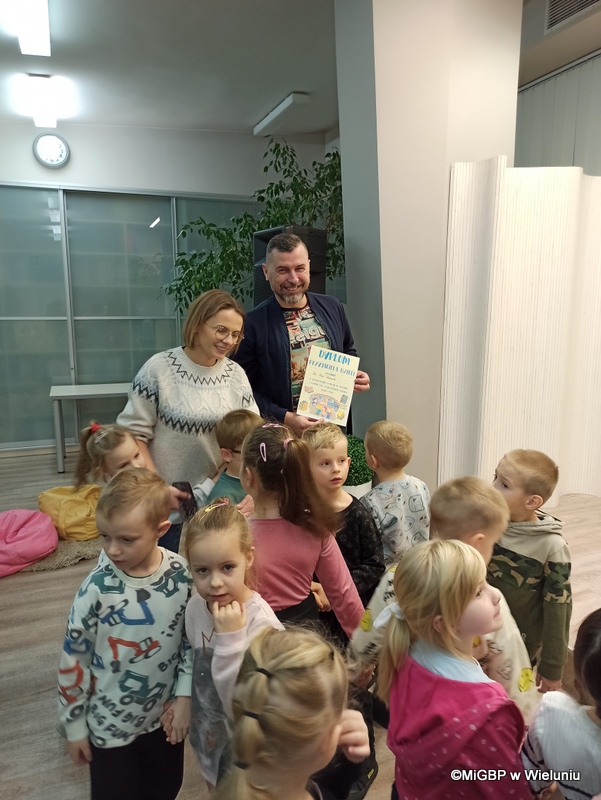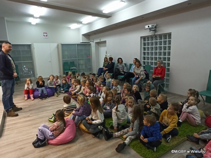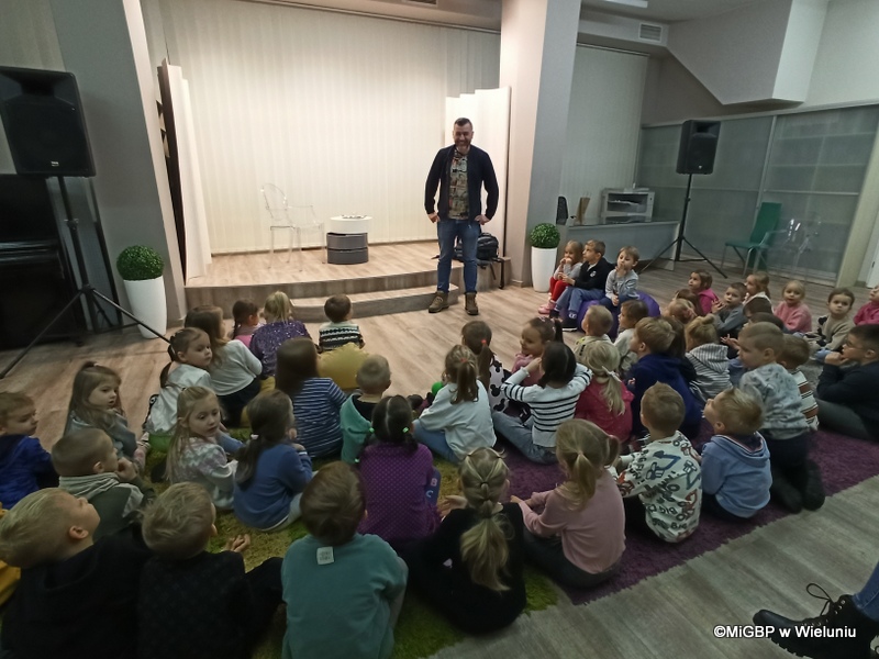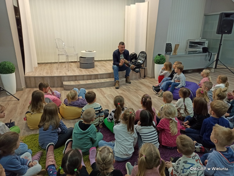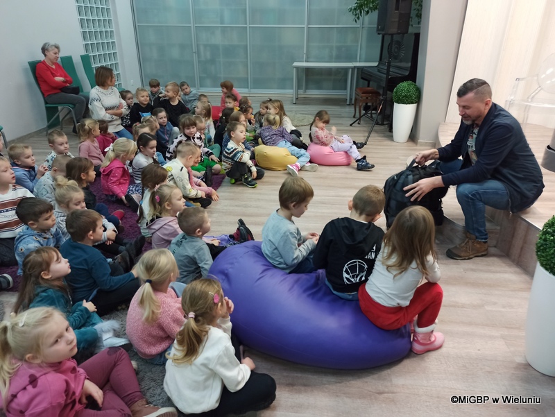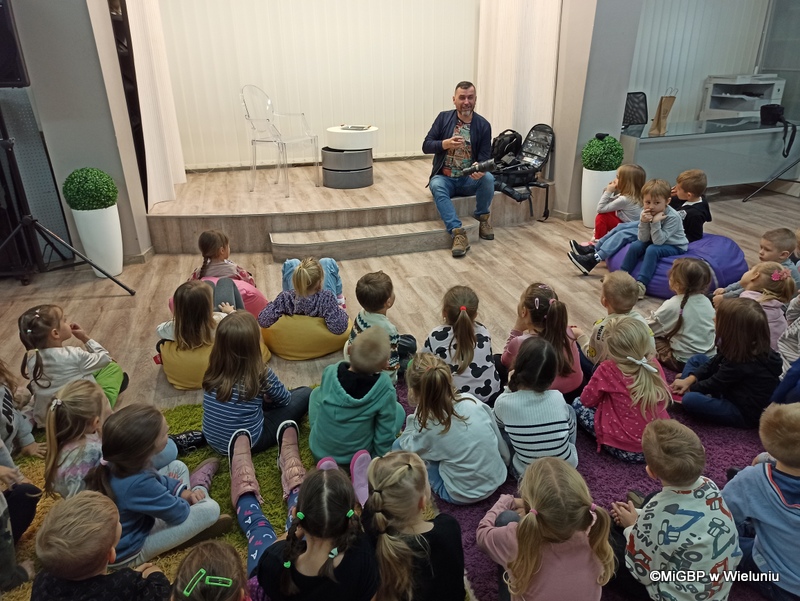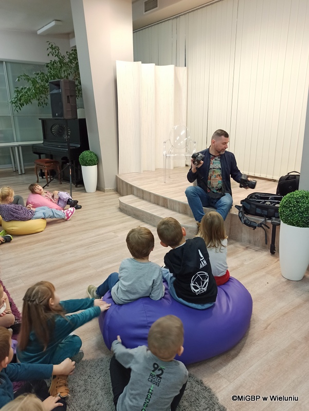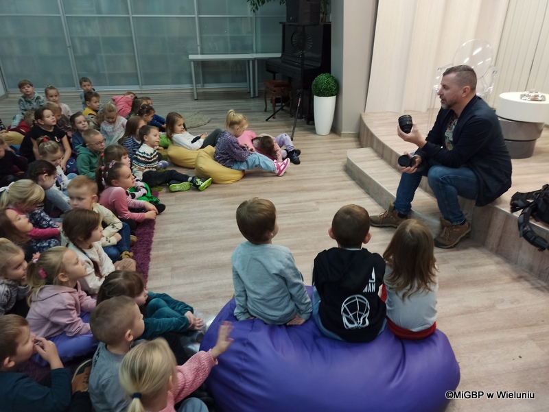 Mali goście z Przedszkola nr 2 w Wieluniu mieli okazję poznać tajniki fotografii. Piotr Pabisiak opowiadał o swojej pracy i podkreślał, jak ważne jest dobre wykonanie zdjęcia.