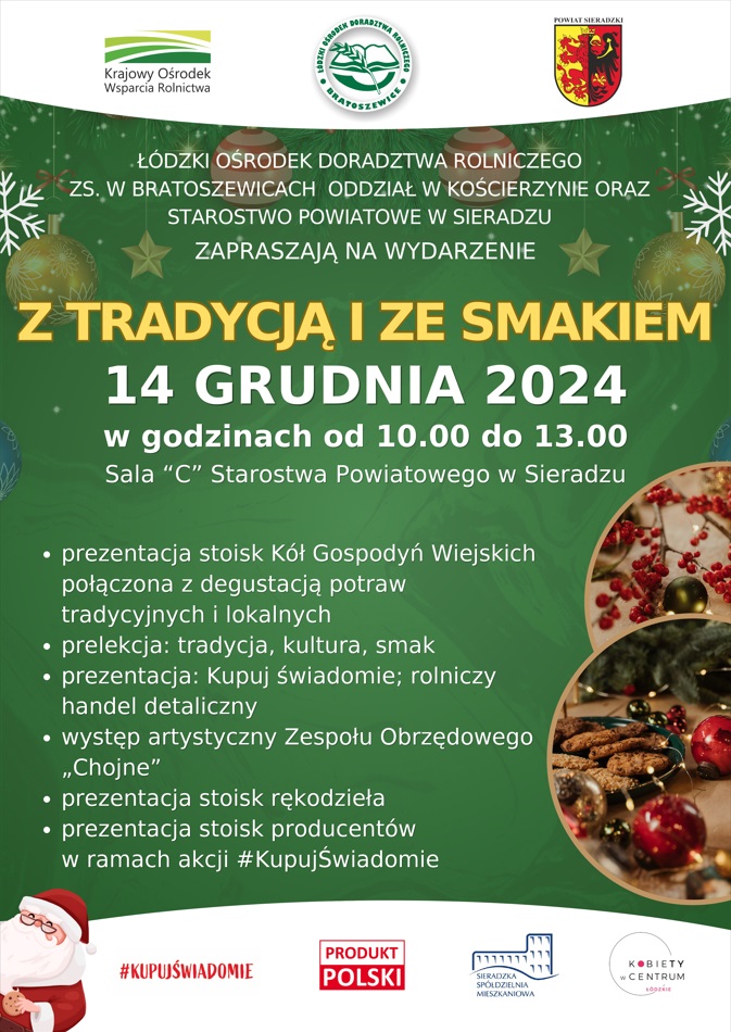 Łódzki Ośrodek Doradztwa Rolniczego z siedzibą w Bratoszewicach, Oddział w Kościerzynie wraz z partnerami: Krajowym Ośrodkiem Wsparcia Rolnictwa – OT w Łodzi oraz Starostwem Powiatowym w Sieradzu i Miastem i Gminą Błaszki zapraszają 14 grudnia – do Sali C Starostwa Powiatowego w Sieradzu w godzinach 10:00-13:00.