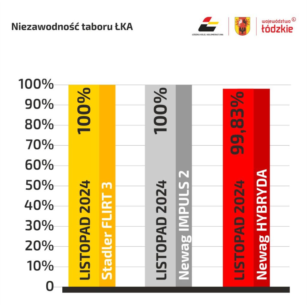 Regionalny przewoźnik chwali się też wysoką sprawnością swojego taboru. W listopadzie pojazdy Stadler FLIRT 3 i Newag IMPULS 2 były niezawodne w 100%, z kolei pociągi Newag Hybryda osiągnęły poziom równy 99,83%. Wskaźnik ten obliczany jest osobno dla każdego typu pojazdu. Pod uwagę brane są czasy włączeń awaryjnych i łączny czas eksploatacji pojazdów. Wysoka sprawność taboru wynika m.in. z częstych przeglądów oraz regularnych prac serwisowych.