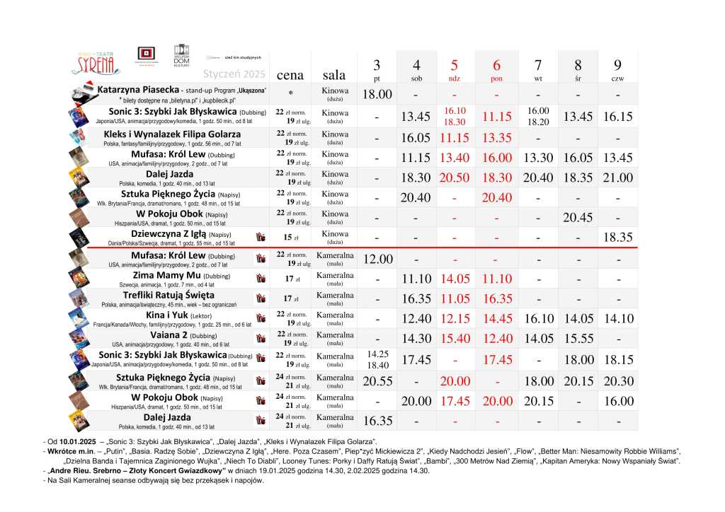 Kino Teatr „Syrena” w Wieluniu zaprasza na seanse filmowe. Na plakacie poniżej prezentujemy, co placówka przy ul. Narutowicza 2 zaprezentuje tuż po powitaniu Nowego Roku, czyli w dniach od 3 do 9 stycznia Bilety można zakupić TUTAJ.