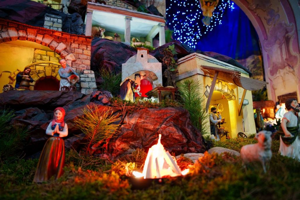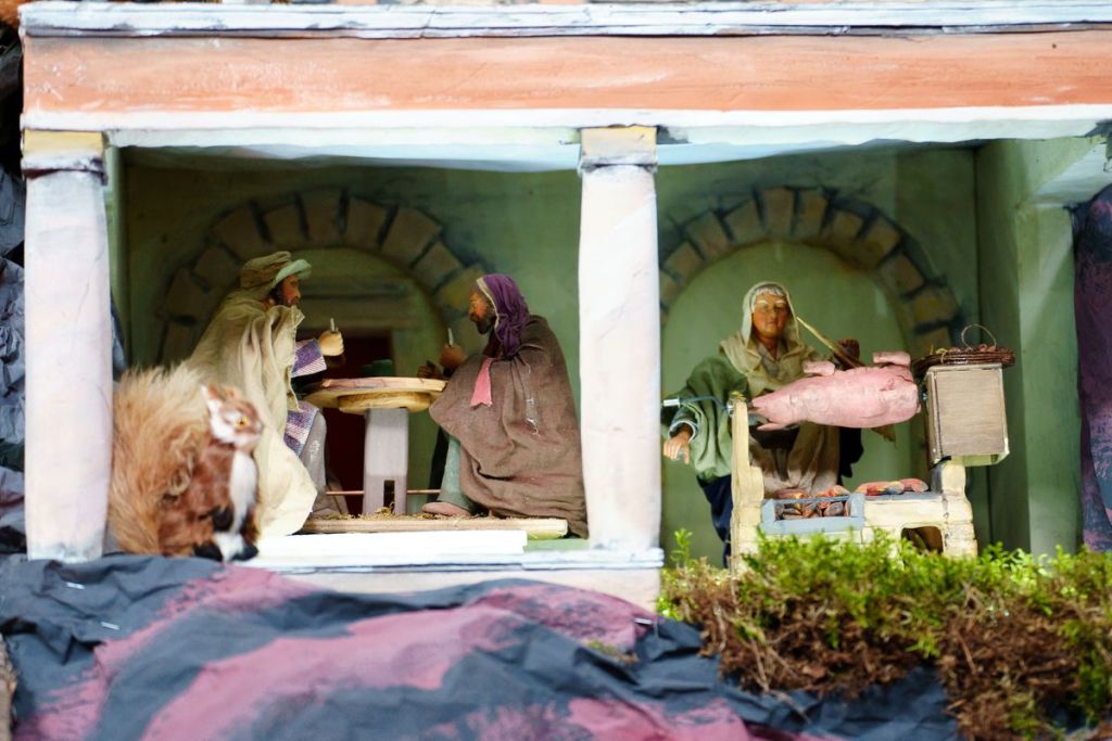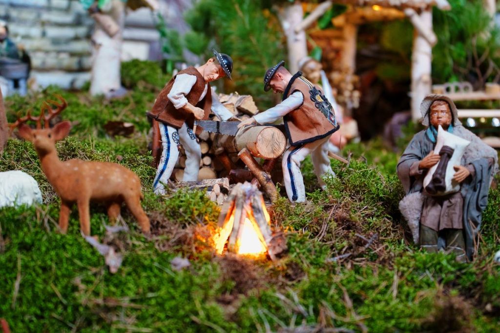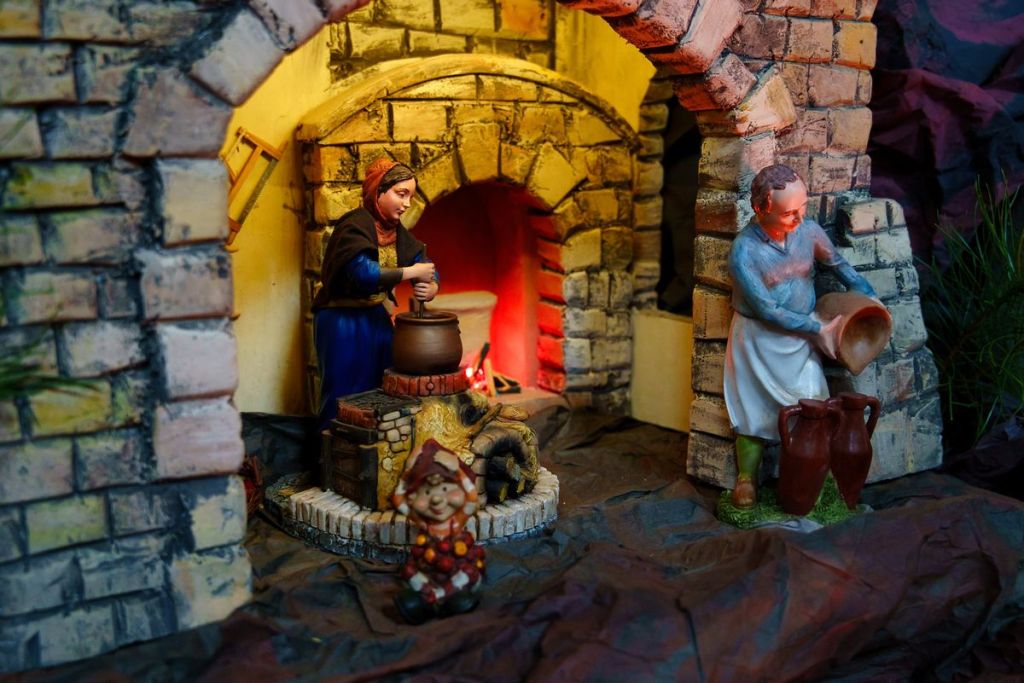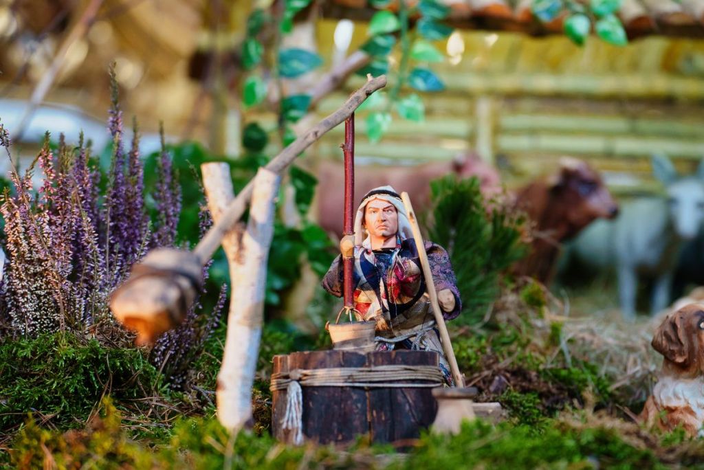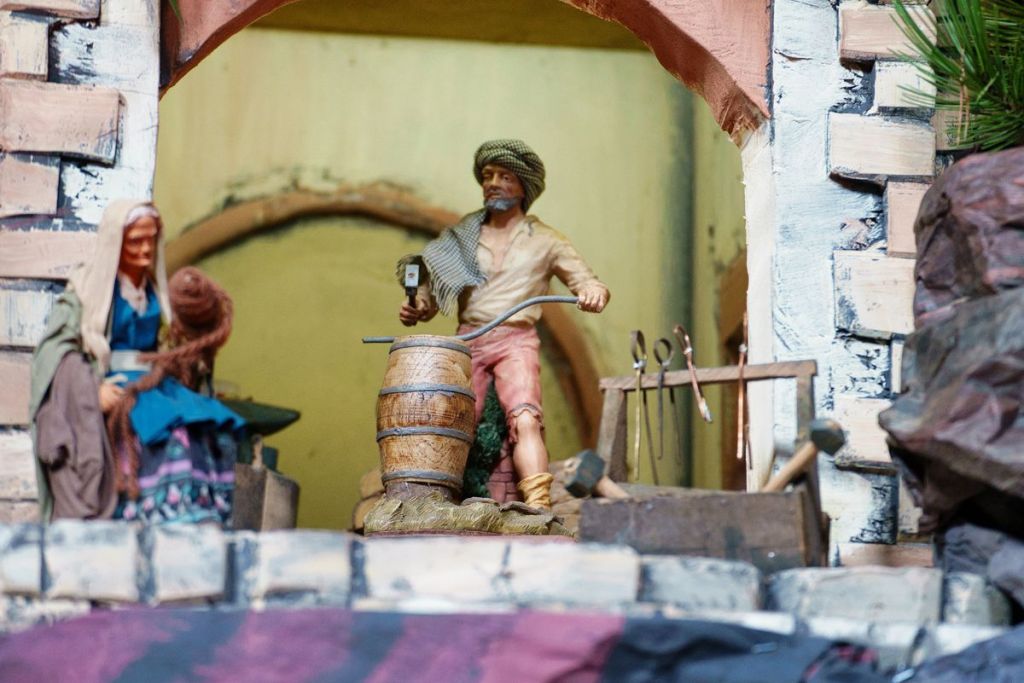 Układ szopki to podróż po Betlejem. W centrum jest Jezus, a wokół toczy się normalnie życie. Znajdziemy tam przedstawicieli różnych zawodów, dzisiaj już często zapomnianych, np. kowala czy garncarza.