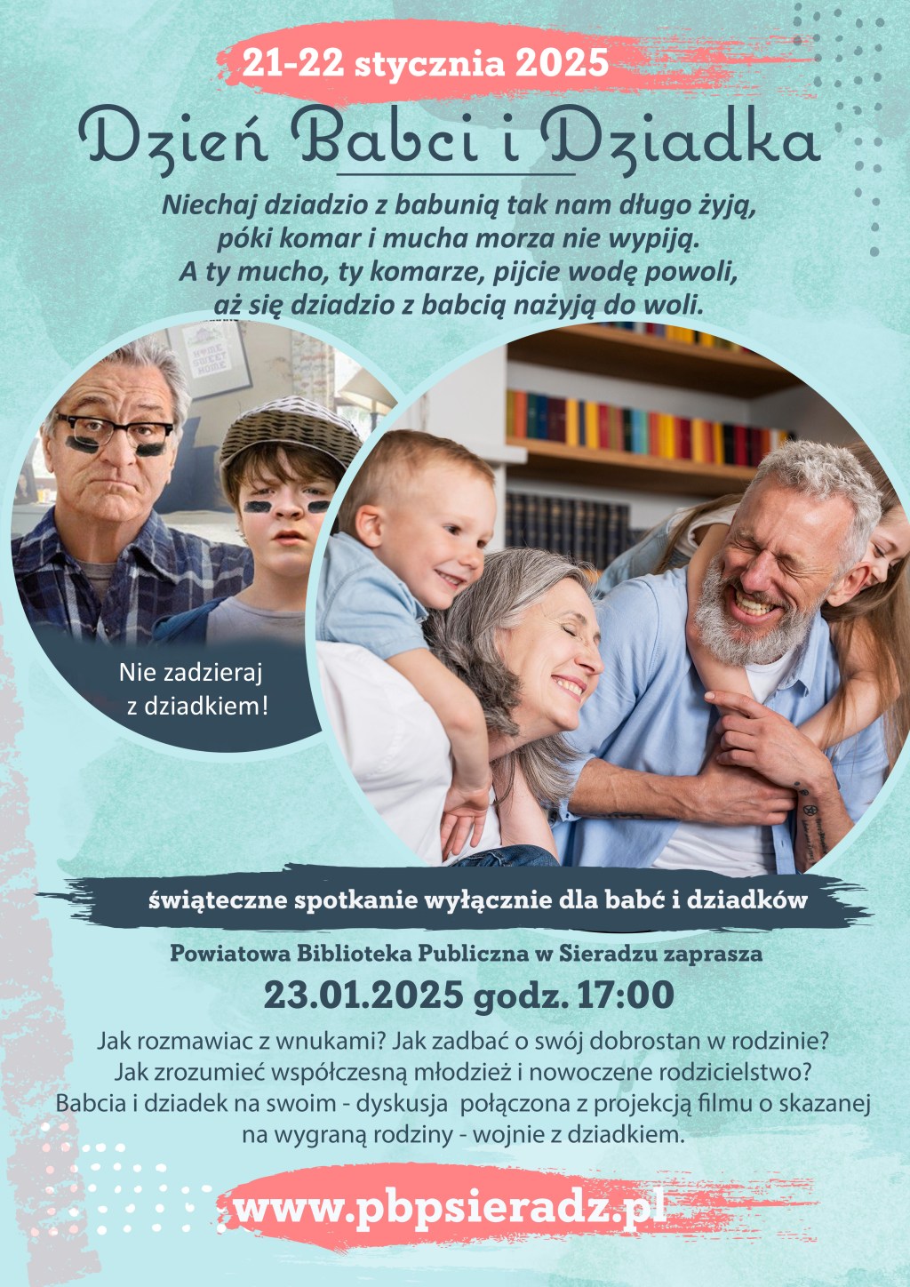 Powiatowa Biblioteka Publiczna w Sieradzu zaprasza w środę 23 stycznia o godz. 17:00 do placówki przy ul. Żwirki i Wigury na spotkanie z okazji Dnia Babci i Dziadka.
