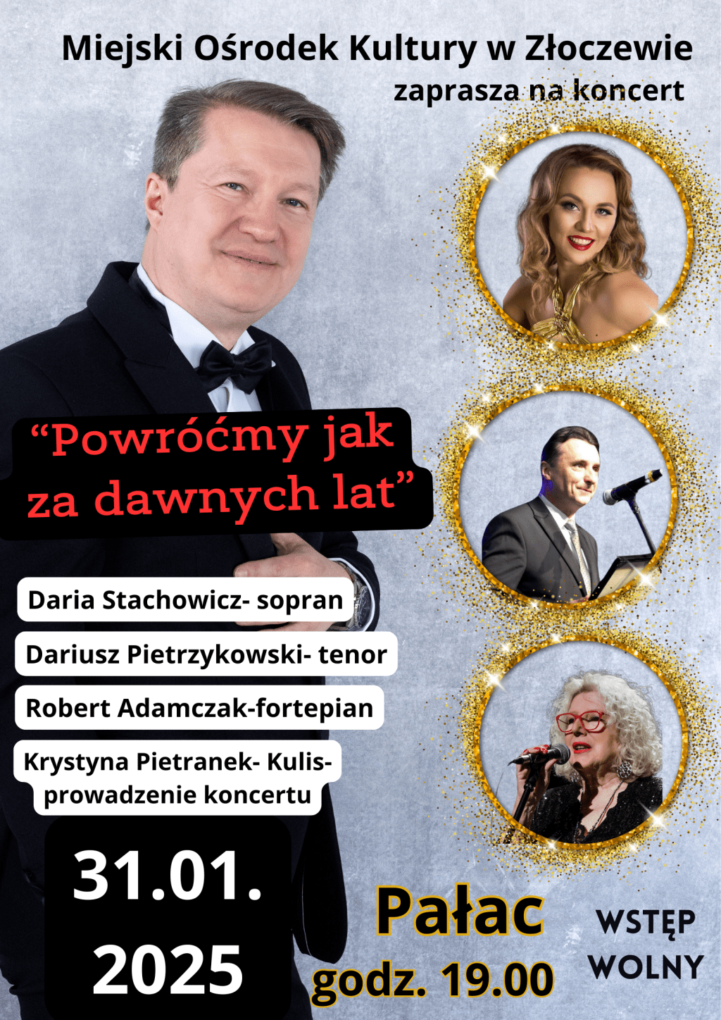 31 stycznia (piątek) o godz. 19.00 odbędzie się koncert pt. „Powróćmy jak za dawnych lat”, który wykonają: