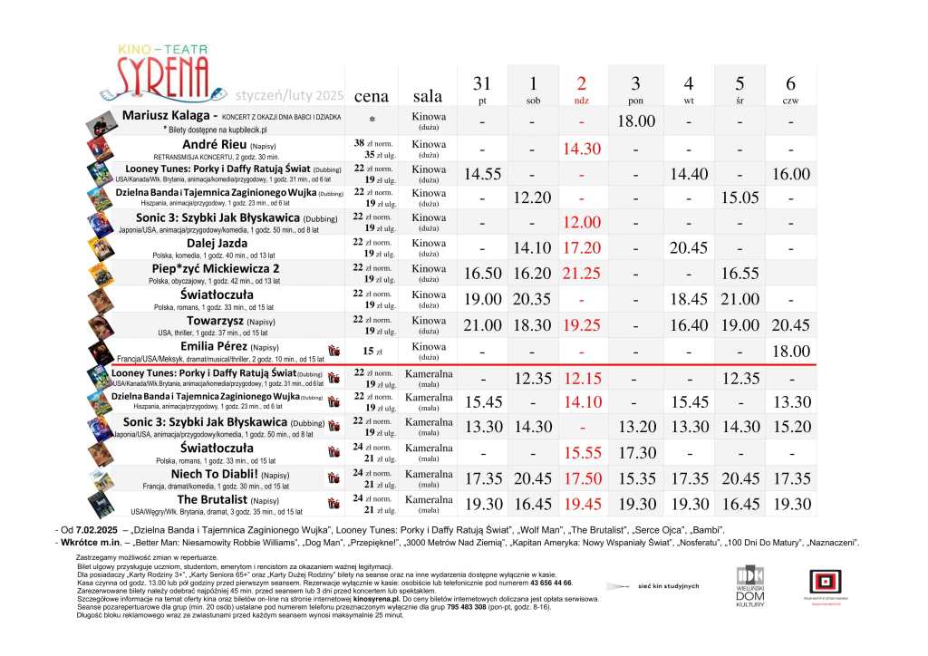 Kino Teatr „Syrena” w Wieluniu zaprasza na seanse filmowe. Na plakacie poniżej prezentujemy, co placówka przy ul. Narutowicza 2 zaprezentuje w dniach od 31 stycznia do 6 lutego. Bilety można zakupić TUTAJ.