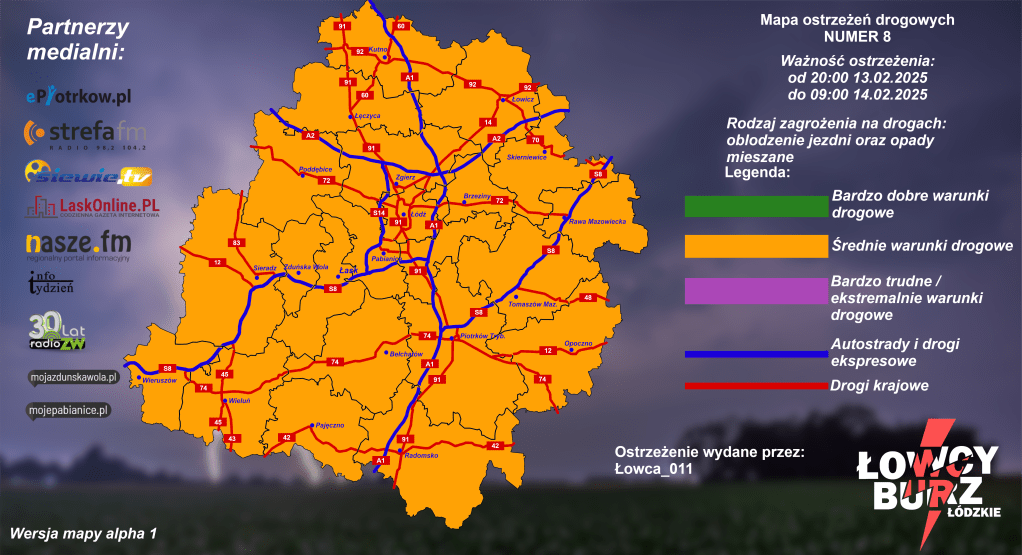 Grupa Łowcy Burz Łódzkie ostrzega przed opadami śniegu i marznącego deszczu, a także przed oblodzeniem jezdni. Przewidywane są średnie warunki pogodowe (choć grupa zaznacza możliwość aktualizacji, o czym będziemy informować). Ostrzeżenie obowiązuje w całym województwie łódzkim – w tym w powiatach: sieradzkim, wieluńskim i wieruszowskim.