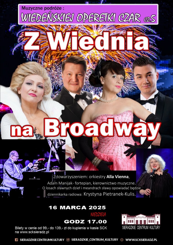 Sieradzkie Centrum Kultury zaprasza na koncert – Muzyczne podróże: „Wiedeńskiej operetki czar. Część 5. Z Wiednia na Brodway”, który zaplanowano na 16 marca (niedziela) na godz. 17:00 w Sieradzkim Centrum Kultury (Teatr Miejski).