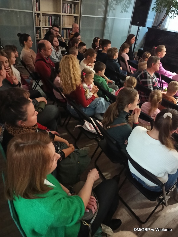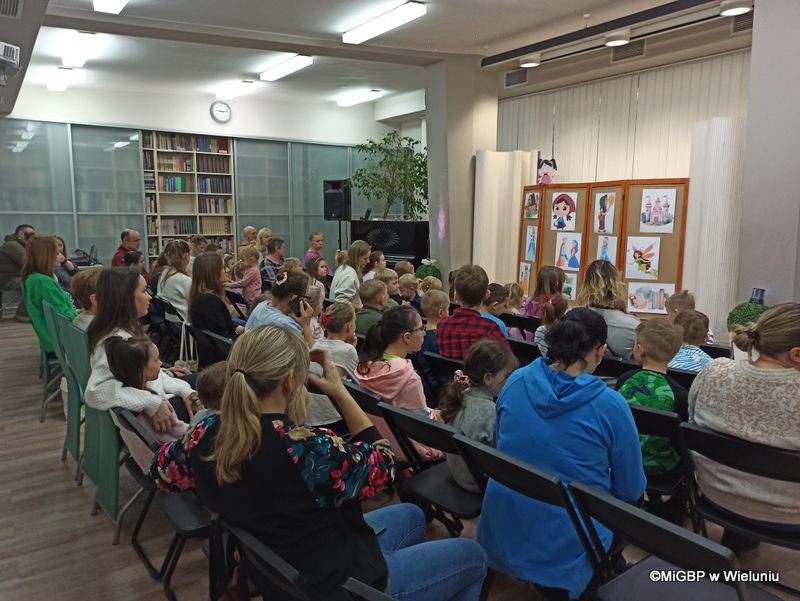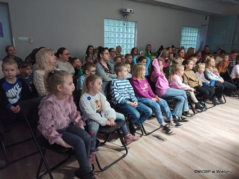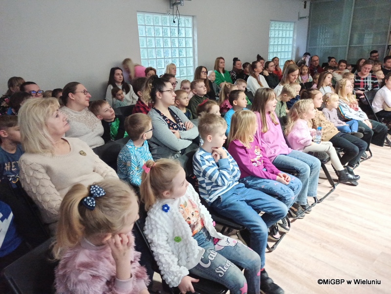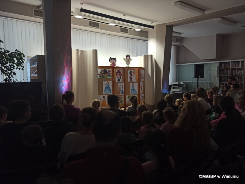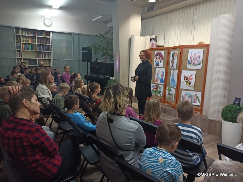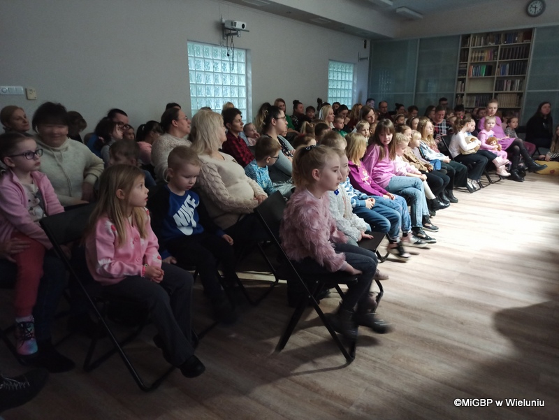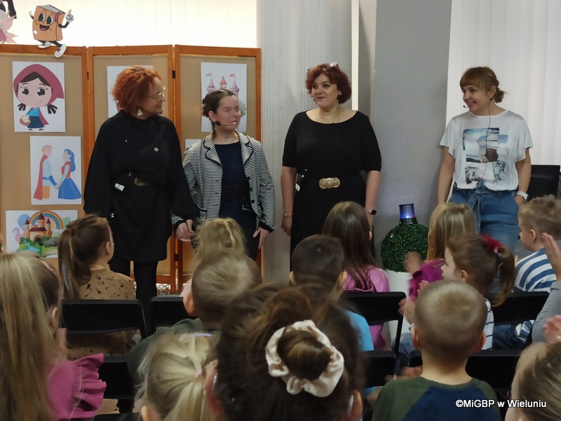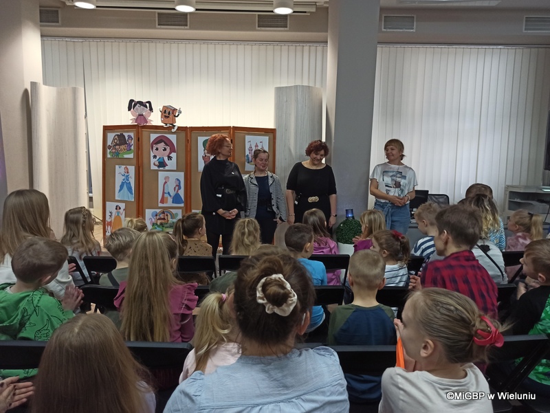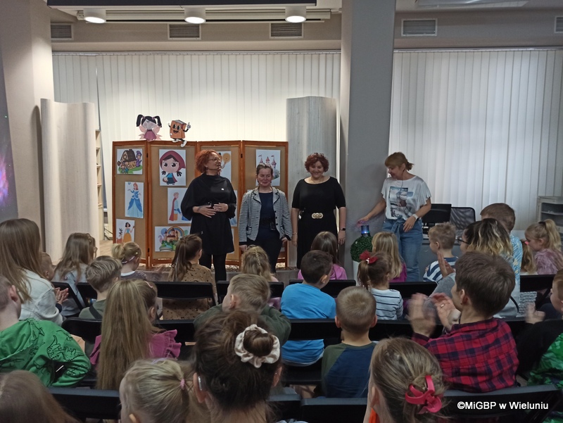 Przedstawienie, przygotowane przez pracownice wieluńskiej biblioteki, było pełne emocji i radości! Podczas spektaklu na scenie pojawiały się kolejno różne postacie z popularnych bajek, a dzieci z zaangażowaniem odgadywały, z jakiej bajki pochodzą. Całość przeplatana była piosenkami z ulubionych bajek, co dodało wyjątkowego klimatu.