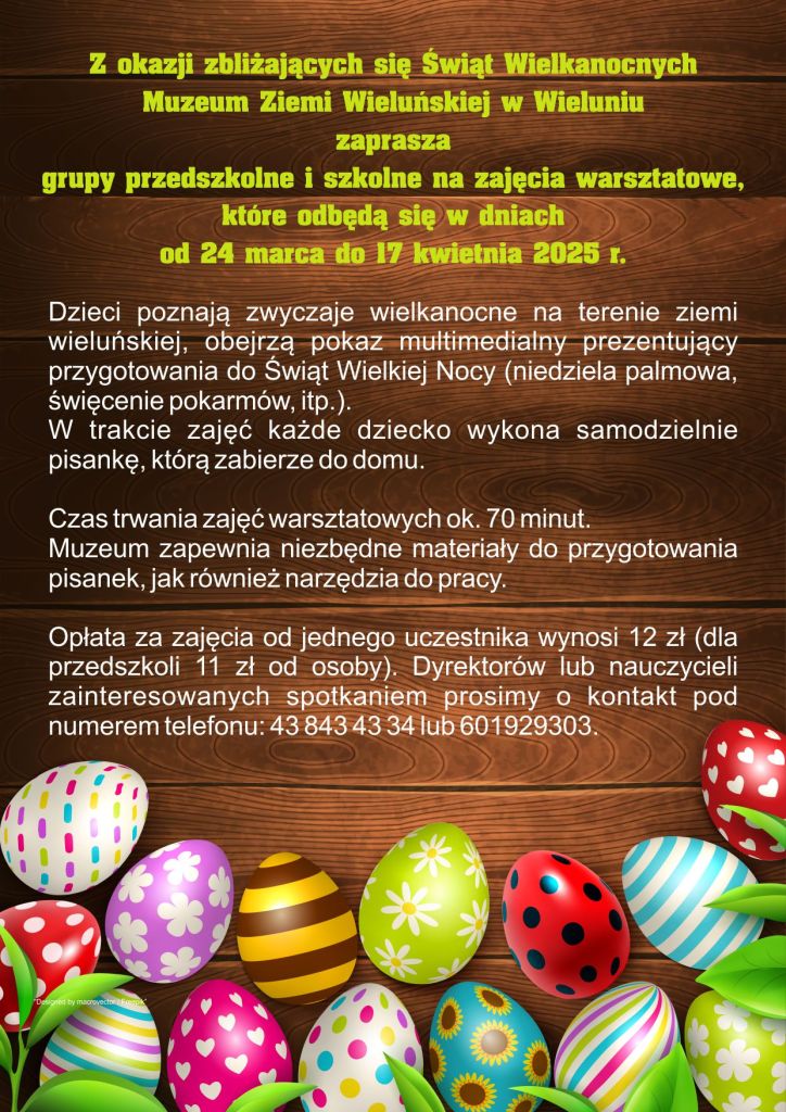 Muzeum Ziemi Wieluńskiej zaprasza na warsztaty wielkanocne, które rozpoczną się w ostatnim tygodniu marca. Rezerwacje i zapisy już ruszyły. Szczegółowe informacje dla szkół możecie znaleźć na plakacie poniżej.