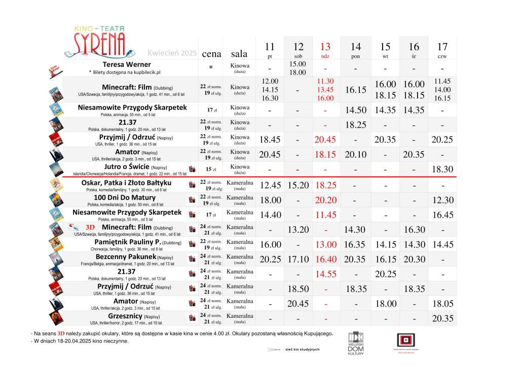 Kino Teatr „Syrena” w Wieluniu zaprasza na seanse filmowe. Na plakacie poniżej prezentujemy, co placówka przy ul. Narutowicza 2 zaprezentuje w dniach od 11 do 17 kwietnia. Bilety można zakupić TUTAJ.