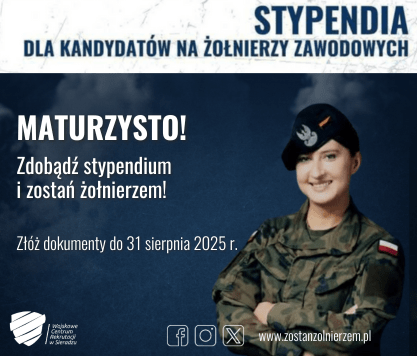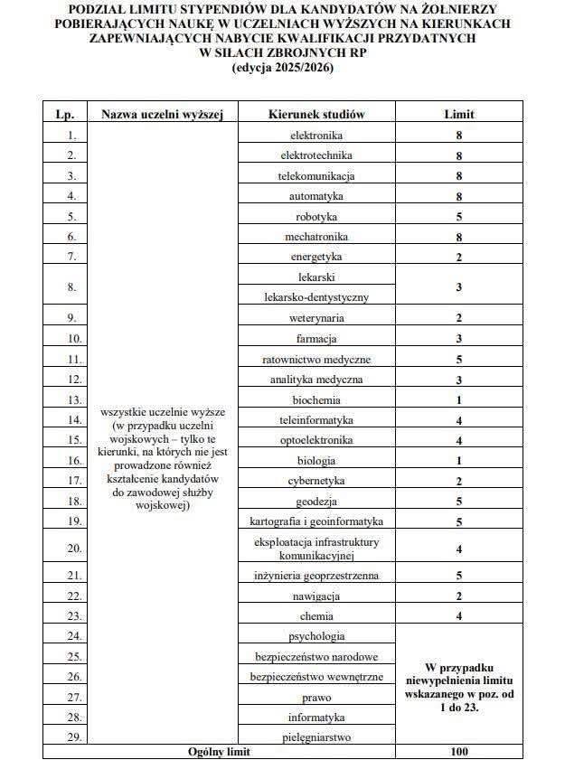 Szansę zapewnienia sobie środków finansowych na czas nauki mają studenci cywilnych uczelni wyższych w całej Polsce. Ministerstwo Obrony Narodowej ogłosiło „Podział limitu stypendiów dla kandydatów na żołnierzy pobierających naukę w uczelniach wyższych na kierunkach zapewniających nabycie kwalifikacji przydatnych w Siłach Zbrojnych RP – edycja 2025/2026”.
