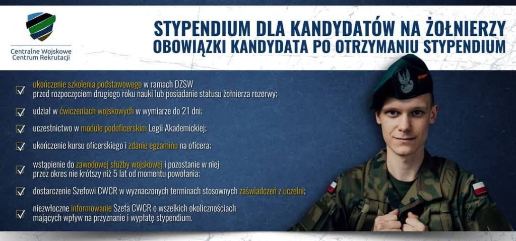 Wojskowe Centrum Rekrutacji w Sieradzu przypomina o możliwości otrzymania stypendium przez kandydatów na żołnierzy zawodowych. Trwa nabór do programu stypendiów wspierających studentów cywilnych uczelni wyższych na wybranych kierunkach zapewniających nabycie kwalifikacji przydatnych w Siłach Zbrojnych RP.