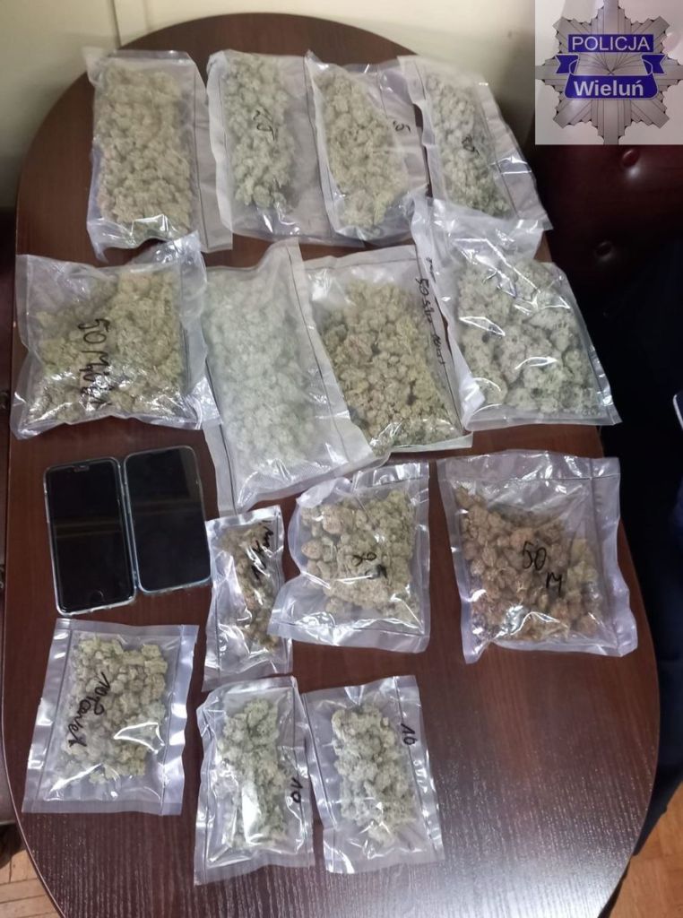 Wieluńscy kryminalni prowadząc działania ukierunkowane na zwalczanie przestępczości narkotykowej oraz weryfikując informacje z prowadzonego postępowania wytypowali 26-latka mogącego mieć związek z narkotykowym procederem. Mężczyzna wpadł w ręce funkcjonariuszy 17 maja na terenie gminy Skomlin, gdzie poruszał się samochodem bmw wraz z innym 26-latkiem. Podejrzenia policjantów potwierdziły się. W pojeździe, którym jechali podczas przeszukania zabezpieczono kilkanaście worków z suszem roślinnym o wadze ponad 500 gramów. Wstępne badania potwierdziły, że była to marihuana. Jak ustalono środki odurzające należały do 26-letniego mieszkańca województwa dolnośląskiego. Drugi z mężczyzn posiadał elektroniczne papierosy z zawartością THC. Obaj zostali zatrzymani. Dodatkowo funkcjonariusze przeprowadzili przeszukania w miejscach zamieszkania, jak również budynków gospodarczych 26-letniego mieszkańca województwa dolnośląskiego. Tam zabezpieczono kolejne środki odurzające, łącznie ponad 1500 gramów substancji pochodzących z grupy marihuany, papierosy elektroniczne z zawartością THC, młynek, zgrzewarkę oraz wagi elektroniczne. Obaj mężczyźni usłyszeli już zarzuty z ustawy o przeciwdziałaniu narkomanii. 26-letni mieszkaniec Dolnego Śląska został doprowadzony do Prokuratury Rejonowej w Wieluniu, gdzie usłyszał zarzut posiadania znacznych ilości środków odurzających oraz przyrządów służących do ich niedozwolonego przetwarzania. Mężczyzna decyzją sądu został tymczasowo aresztowany na 3 miesiące. Drugi z zatrzymanych, 26-letni mieszkaniec powiatu wieluńskiego usłyszał zarzut posiadania środków odurzających.