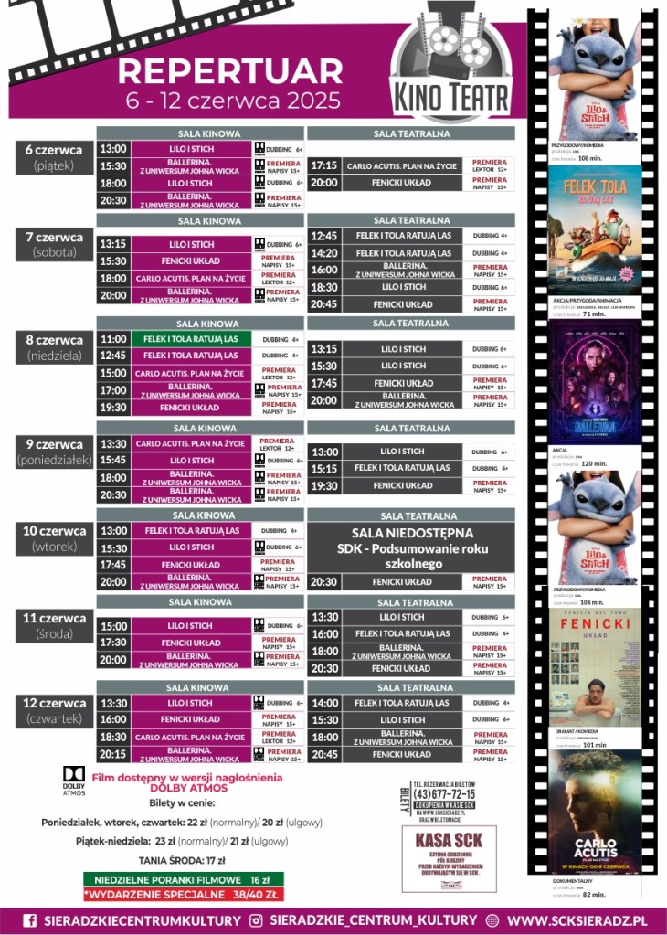 Sieradzkie Centrum Kultury zaprezentowało repertuar kinowy KINO-TEATR SCK SIERADZ obowiązujący od 6 do 12 czerwca. Oprócz filmów „Lilo i Stich” i „Felek i Tola ratują las”, będą też trzy premiery: „Fenicki układ”, „Ballerina. Z uniwersum Johna Wicka” oraz „Carlo Acutis. Plan na życie”.