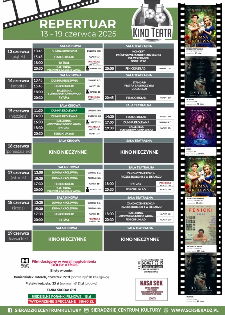 Sieradzkie Centrum Kultury zaprezentowało repertuar kinowy KINO-TEATR SCK SIERADZ obowiązujący od 13 do 19 czerwca. Oprócz filmów „Fenicki układ”, „Ballerina. Z uniwersum Johna Wicka” oraz „Dumna królewna”, będzie też jedna premiera – to film „Rytuał”.