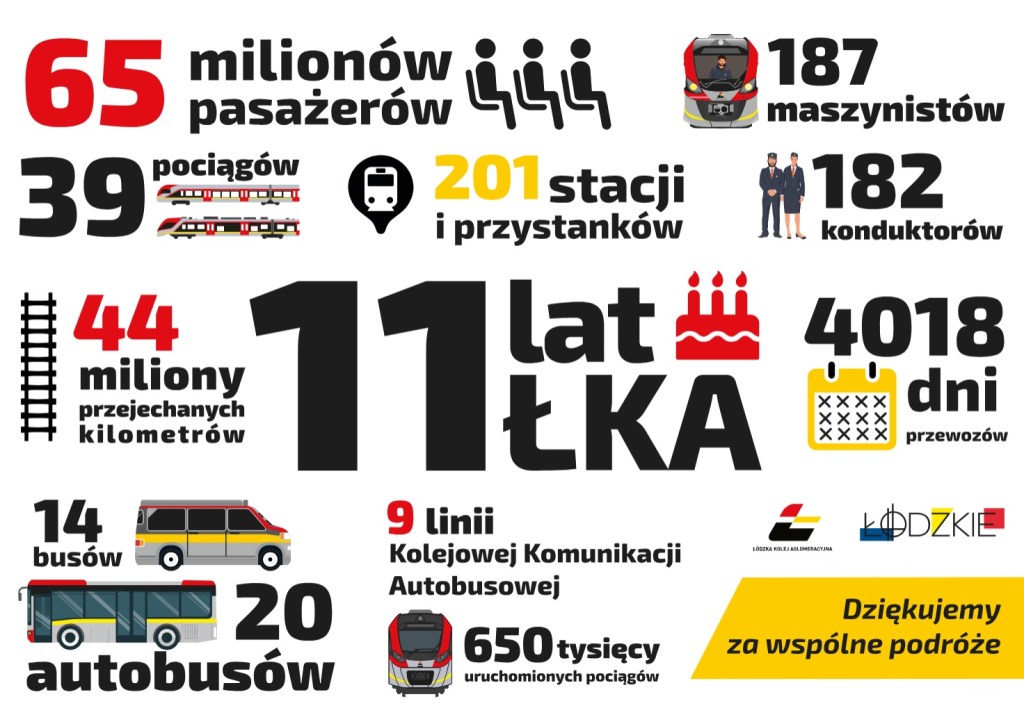 Łódzka Kolej Aglomeracyjna świętuje 15 rocznicę podpisania aktu założycielskiego i 11 rocznicę uruchomienia przewozów kolejowych! Stawiając od początku na dynamiczny rozwój, stała się jednym z najnowocześniejszych przewoźników w Polsce. Dziś ŁKA łączy mieszkańców Województwa Łódzkiego, inwestuje w nowe pojazdy, rozwija siatkę połączeń, angażuje się w życie regionu i stawia na zieloną energię. Jej rozwój był możliwy dzięki wsparciu funduszy europejskich. Spółka jest przykładem racjonalnego i efektywnego wykorzystania tych środków, które pozwoliły na zakup nowoczesnego taboru oraz budowę zaplecza technicznego.