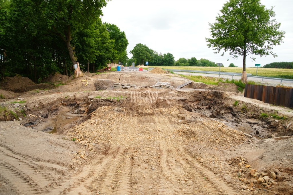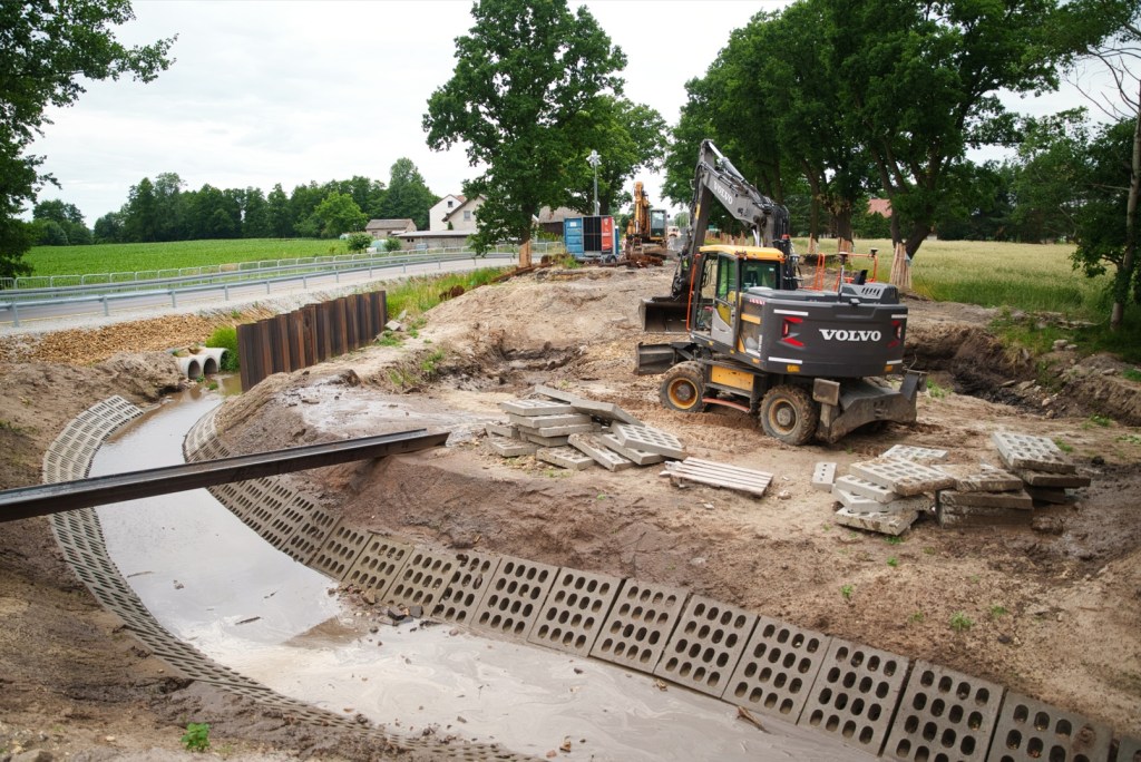 Aktualnie rozbierana jest stara konstrukcja jezdni na drogach dojazdowych do przepustu. Obiekt został już rozebrany, obecnie przygotowywane jest wzmocnienie podłoża pod nową konstrukcję. Ruch pojazdów odbywa się przez wybudowaną obok drogę i obiekt tymczasowy, dzięki czemu komunikacja na tym odcinku może być utrzymana. Prace obejmują również wykonanie kanalizacji deszczowej oraz instalacji teletechnicznych.