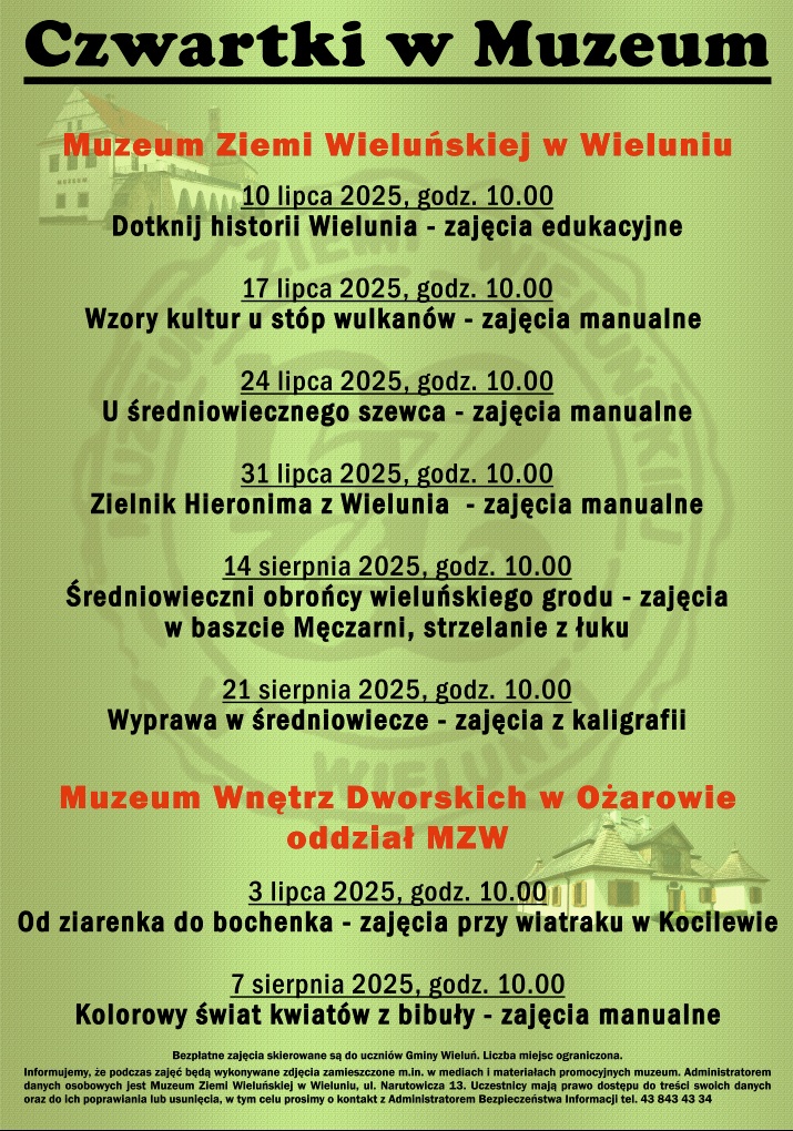 Ilość miejsca na zajęcia ograniczona! Warto dokonać wcześniejszych zapisów pod numerem telefonu 43 843 43 34 dla zajęć w Muzeum Ziemi Wieluńskiej Wieluniu oraz 43 841 17 24 dla zajęć w Muzeum Wnętrz Dworskich w Ożarowie, Oddziale MZW.