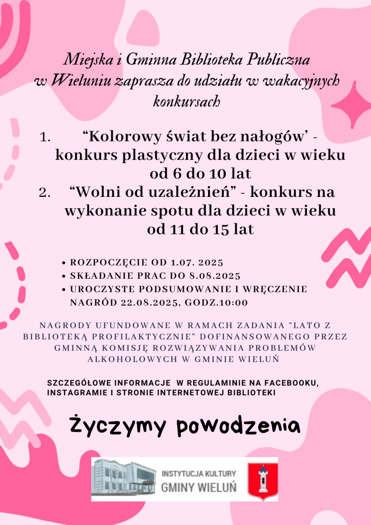 Miejska i Gminna Biblioteka Publiczna w Wieluniu zaprasza do udziału w dwóch wakacyjnych konkursach w bibliotece o tematyce przeciwko uzależnieniom. Skierowany jest dla uczniów szkół podstawowych z terenu gminy Wieluń.